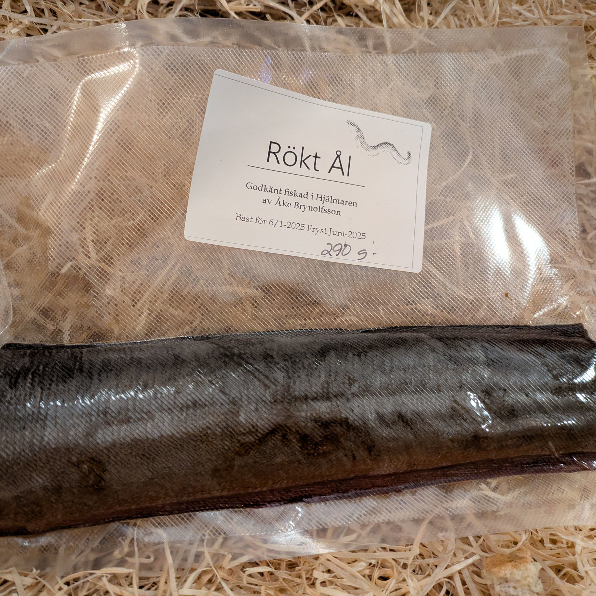 Rökt ål godkänt fiskad i Hjälmaren av Åke Brynolfsson.